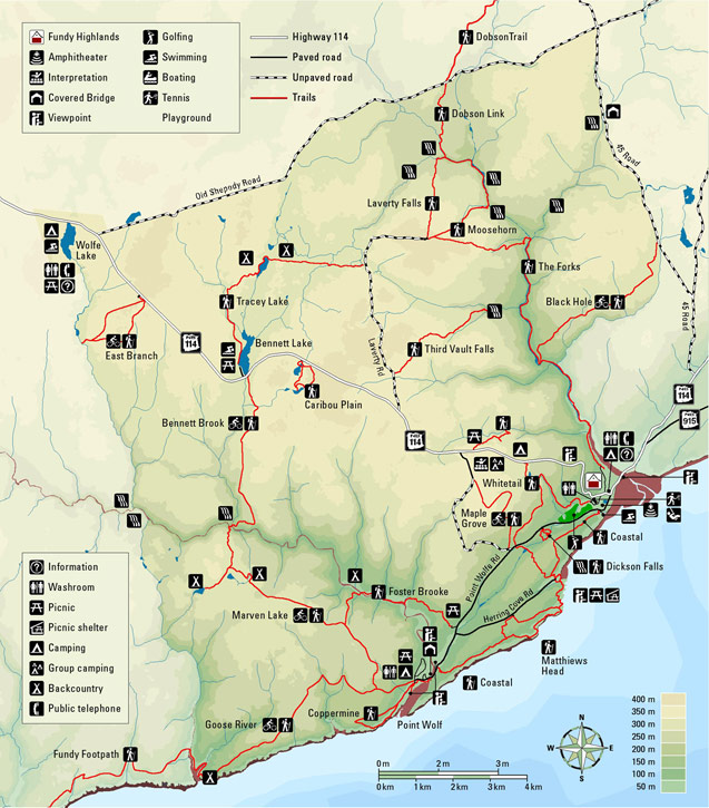 Our park has over 100 kilometres of hiking trails, both inland and along the coast. A number of the trails lead to waterfalls, rivers and secluded lakes, which are excellent for swimming. Fundy Park also has six trails for mountain biking.